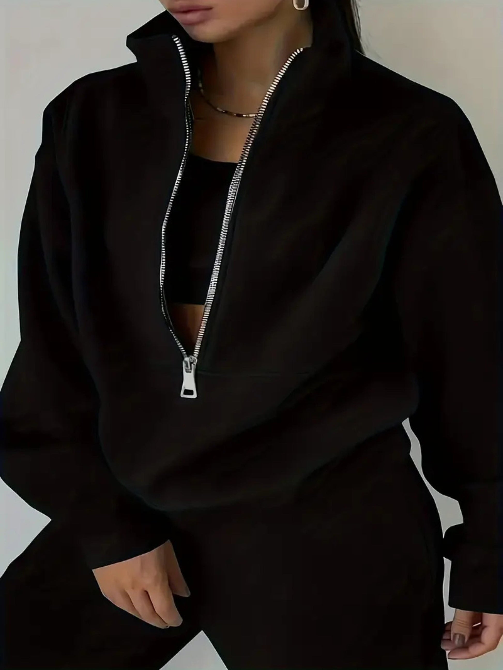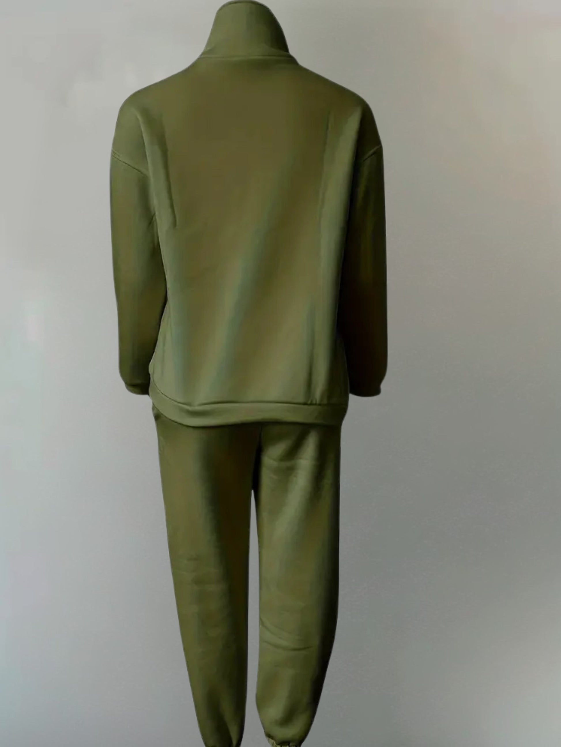 Our new Alexandra is a casual two-piece set with a high zip-up collar and relaxed jogger-style bottoms. The clean lines and structured silhouette make it easy to throw on while still looking pulled together. It’s perfect for days when you want comfort without compromise.